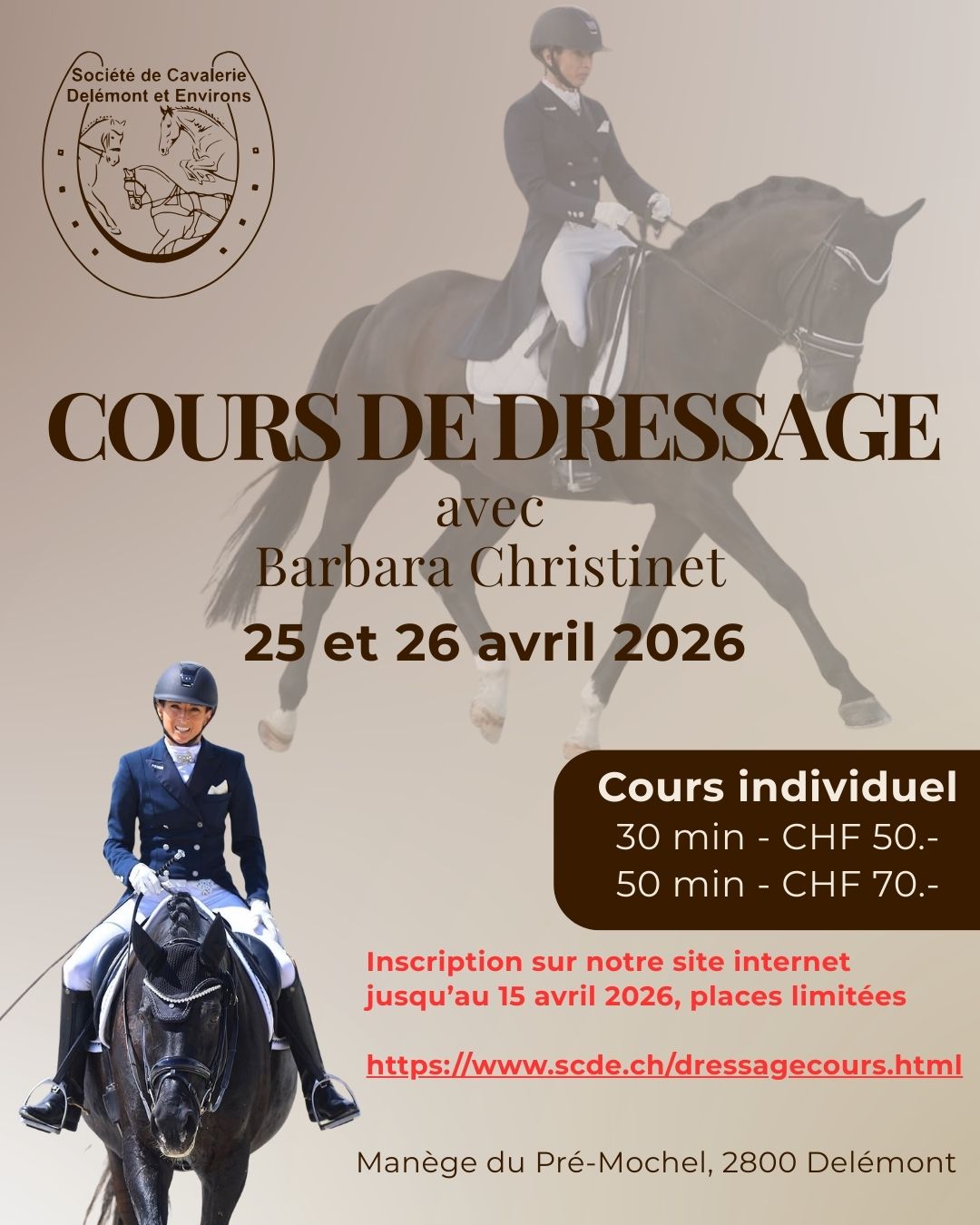 La société a le plaisir de vous proposer des cours avec Barbara Christinet, juge de dressage et cavalière niveau Saint-Georges.